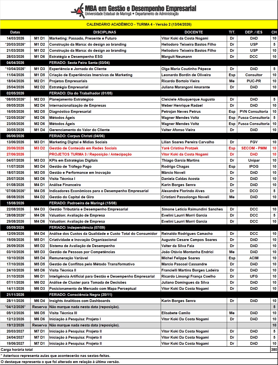 CALENDÁRIO MBA - TURMA 4 - Atualizado em 26/02/2026.
